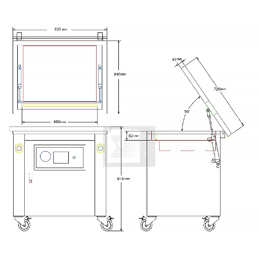 ✓ Kích thước buồng hút: 660 x 510 x 80 mm; Kích thước máy: 820 x 640 x 910 mm; Trọng lượng máy: 140 kg