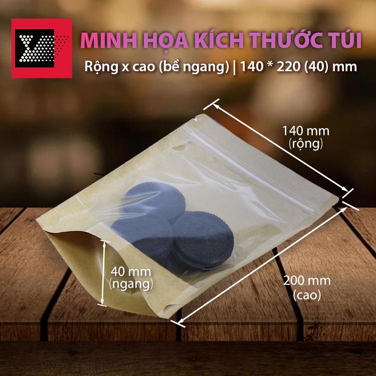 | Kiểu túi | Túi zip, đáy đứng, một mặt trong một mặt giấy kraft vàng, mép xé chữ U | ||